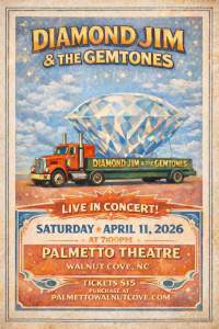 Home / 2026 Concerts / Diamond Jim & The Gemtones (2026) Diamond Jim & The Gemtones (2026)$15.00 In stock Diamond Jim & The Gemtones (2026) quantity Your browser must support JavaScript in order to purchase ticket(s). Ticket #1 First Name: * Last Name: * Email: * Privacy Preference: Opt-out from being displayed in the public list of attendees. Buy Ticket Now SKU: 2026-0411 Category: 2026 Concerts Share this: Print (Opens in new window) Print Email a link to a friend (Opens in new window) Email Description Description Like this:Like Loading... Related products S.F.D. Band & Will Easter $15.00 Ticket Detail Jim Quick & Coastline (2026) $30.00 Ticket Detail An Evening With Taylor Vaden $20.00 Ticket Detail The Ultimate Eagles Tribute “On The Border” (Middle of House) $45.00 Ticket Detail